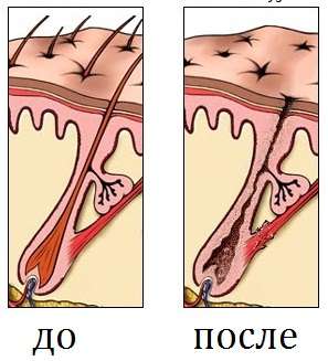 Методика лазерной эпиляции заключается втом, что используется принцип направленного светового потока. Лазерный луч, создающий высокую плотность мощности излучения, способен произвести значительный местный тепловой эффект, который сопровождается реактивной коагуляцией фолликулярной зоны, вапоризацией (выпаривание) и карбонизацией (обугливание) окружающих фолликул тканей. Проще говоря, фолликул сжигается, "высушивается" и "обугливается".